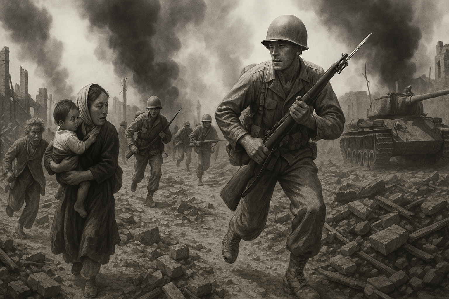 1950년 6월 25일 새벽, 북한군이 38선을 넘어 전면 남침하며 한국전쟁이 발발했다. 전쟁은 단숨에 한반도 전역으로 확산되었고, 민간인을 포함한 전 국민이 전쟁의 소용돌이에 휘말렸다. 3년 1개월간 이어진 이 전쟁은 군사적 충돌을 넘어, 민족 분단을 고착화시키고 한국 사회 전반에 지대한 영향을 남겼다.